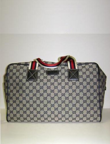 This authentic Gucci handbag comes directly from designer boutiques beige blue GG logo fabric with double signature fabric web handles Zip top closure, light-and double-gold hardware leather belts with interior zip pocket Dimensions: 17"W x 11"H x 9"D This Purse with original cards, dust bag, Gucci Gucci tag and shopping bag Made in Italy