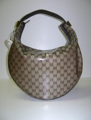 This authentic Gucci Hobo handbag 181492 Duschessa comes directly from designer boutiques - Crystal beige-brown GG logo coated canvas fabric with brown leather trim - Zip-top closure, light gold hardware arches on both sides and single leather strap - interior lining with zip and cell phone bag - Dimensions: 14"W x 10"H x 2"D - This purse comes with original cards, dust bag, Gucci Gucci tag and Shopping Bag - Made in Italy