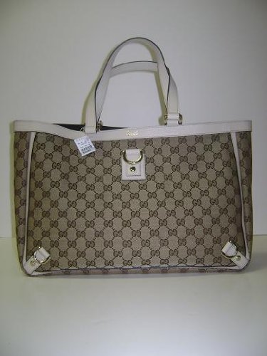 - This authentic Gucci Beige Abbey Tote 141,472 comes directly from designer boutiques - Beige GG logo fabric with cream leather trim - Golden Gucci D-rings and Gucci logo embossed on the front. Double strap - snap top closure, light gold hardware - interior lining and a zip pocket - Dimensions: 15 "W x 10" H x 4 "D - This bag comes with original cards, bags, Gucci, Gucci tag, and Shopping Bag - Made in Italy